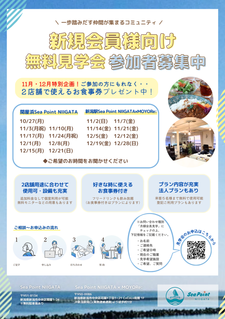 海の見えるコワーキングスペースSea Point NIIGATAと、新潟駅直結Sea Point NIIGATA×MOYORe:の2店舗が使える月額会員プラン見学説明会のお知らせです。見学説明会はご予約制でお客様お一人、お一人とご利用方法などをお聞きしながらご説明をさせていただいております。