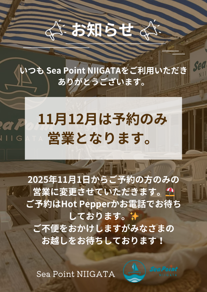 11月、12月は予約のみの営業となります。